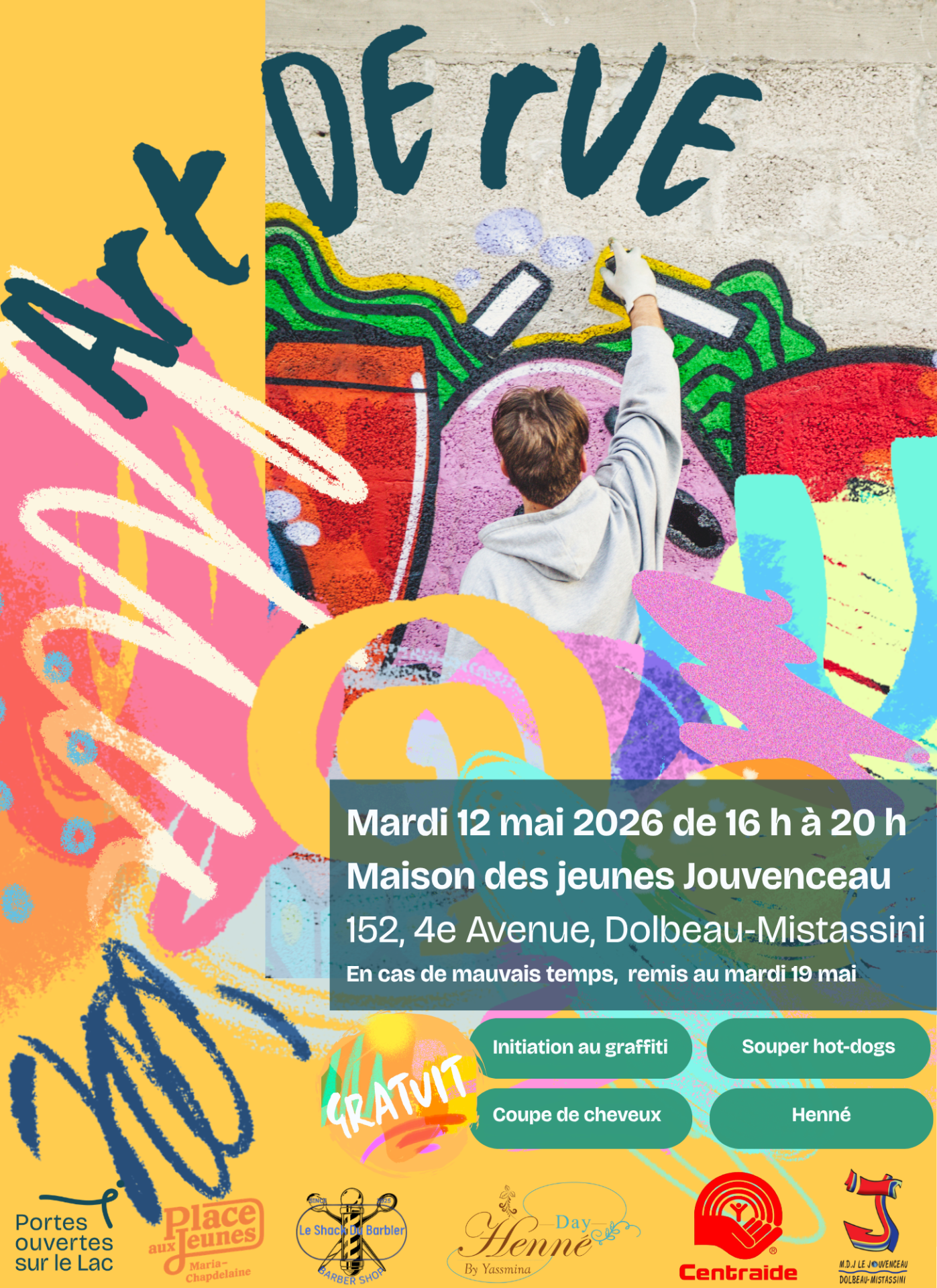 Maison des Jeunes le Jouvenceau–Dolbeau Tu as entre 11 et 17 ans? Cette soirée est pour toi! Viens découvrir l’art du graffiti et participer à une soirée 100 % gratuite et remplie d’action. 📅 Mardi 12 mai 2026 ⏰ 16 h à 20 h 📍 Maison des Jeunes le Jouvenceau, 152, 4e Avenue, Dolbeau‑Mistassini 🌧️ En cas de mauvais temps : remis au mardi 19 mai Au programme : ✅ Initiation au graffiti avec Mohamed et Mike (Portes Ouvertes sur le Lac) ✅ Souper hot-dogs gratuit 🌭(Maison des Jeunes le Jouvenceau) ✅ Coupe de cheveux gratuite avec Sheldon (Le Shack du Barbier 💈) ✅ Henné gratuit avec Yassmina (Henné Day by Yassmina) 🕓 Horaire des activités : • Graffiti : 16 h à 20 h • Souper hot-dogs : 16 h 30 à 17 h 30 • Barbier : 17 h 30 à 19 h 30 • Henné : 18 h à 20 h ℹ️ À savoir : • Porte des vieux vêtements ou apporte un tablier • Gants et masques fournis • Tout le matériel est sur place 👉 Toutes les activités sont offertes gratuitement, grâce au soutien de Centraide ❤️ 🎉 Invite tes amis et viens vivre une soirée créative et […]
